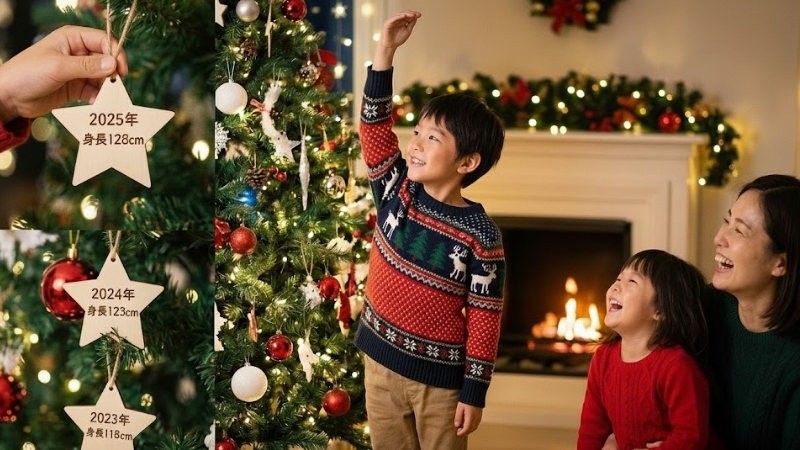 ツリーのオーナメントに 「今年の身長」 を書いて飾ってみるご家庭もありますよ。
